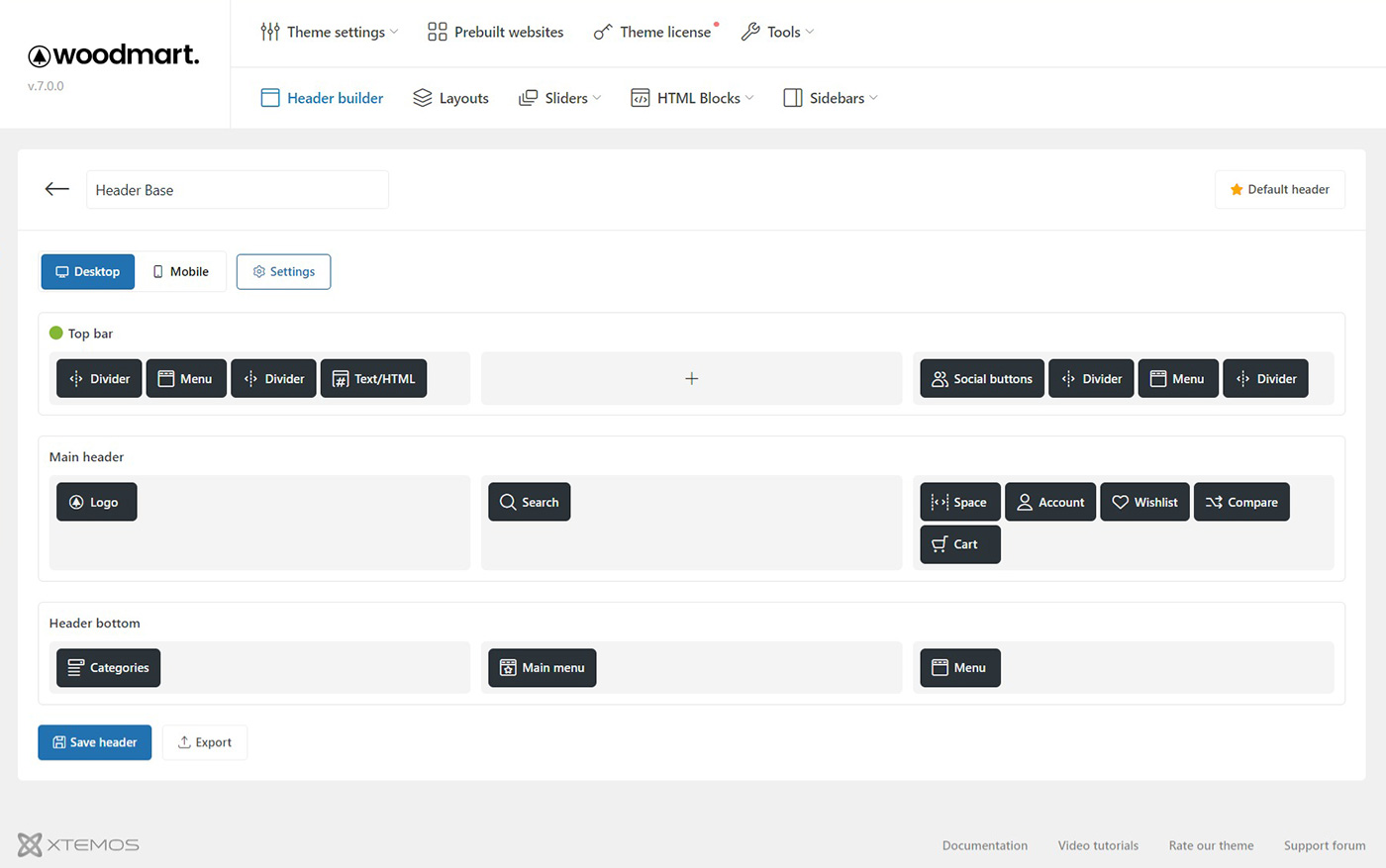 Cu ajutorul constructorului de header din Panou de control, poți personaliza ușor partea superioară a site-ului și poți adăuga orice element ai nevoie. Ai la dispoziție o bibliotecă de elemente precum meniuri, logo, coș de cumpărături, wishlist, blocuri HTML, butoane sociale, căutare și altele.