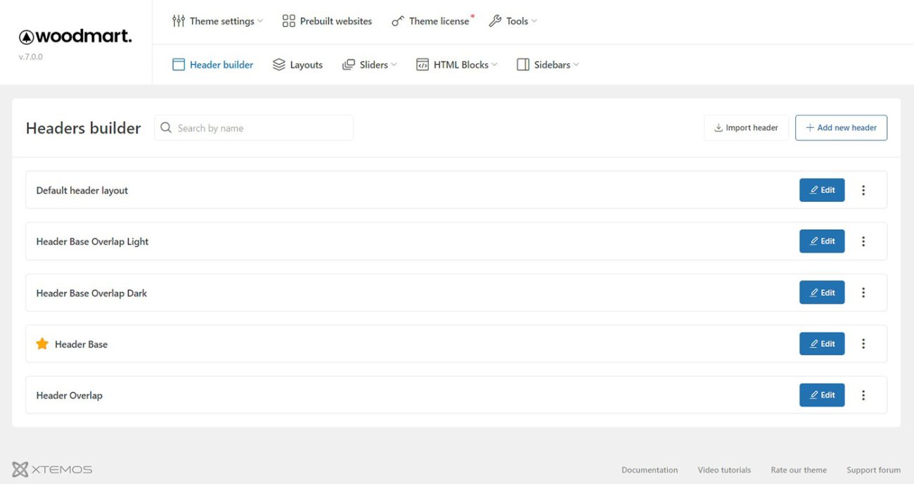Poți edita header-ele existente, poți crea unele noi, le poți importa sau șterge. Poți seta un header ca implicit pentru site folosind butonul stea.